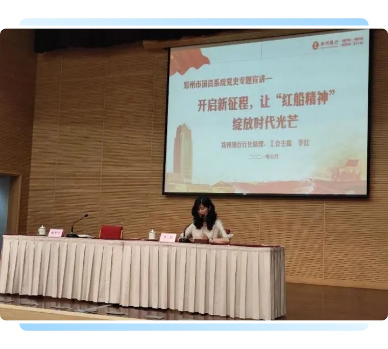 公司黨委邀請鄭州銀行助理、工會主席李紅同志為公司全體職工做了《開啟新征程,讓“紅船精神”綻放時代光芒》的主題演講。李主席以“紅船精神”為著力點,以自身工作經歷為出發(fā)點,通過具體的事例讓大家了解鄭州銀行如何在把握時代脈搏、引領黨建工作中的擔當進取、創(chuàng)新發(fā)展。如何以自身作為表率詮釋著黨員先鋒模范帶頭作用。