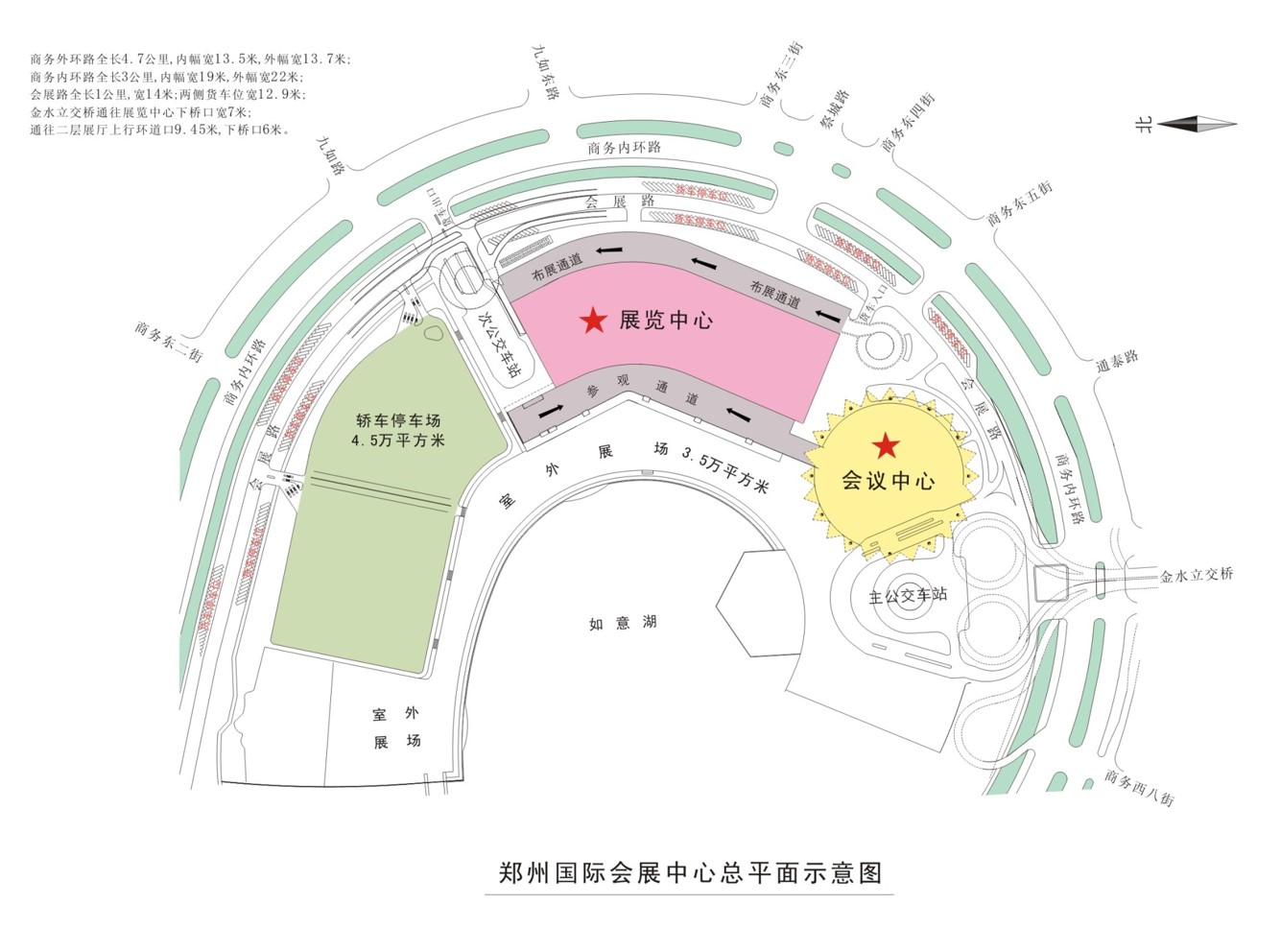 鄭州國際會展中心建筑面積22.68萬平方米,其設施包括會議中心、展覽中心、1.7萬平方米的室外展場及4.5萬平方米的室外停車場。