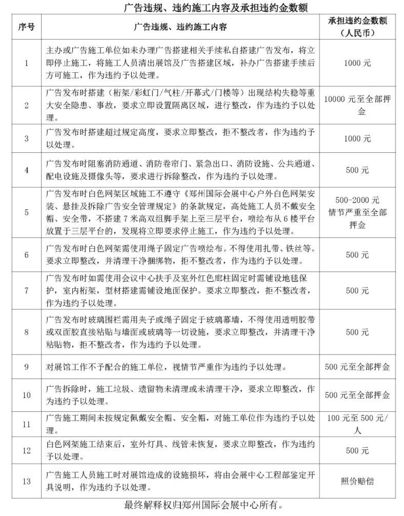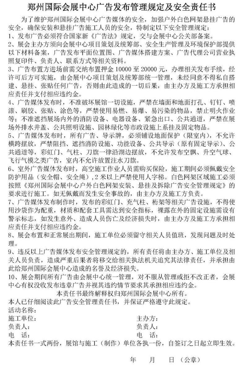 首頁服務(wù)指南主辦指南文章詳情 文章詳情 廣告發(fā)布管理規(guī)定及安全責(zé)任書 廣告發(fā)布管理規(guī)定及安全責(zé)任書 ·《鄭州國(guó)際會(huì)展中心廣告發(fā)布管理規(guī)定及安全責(zé)任書》文檔下載