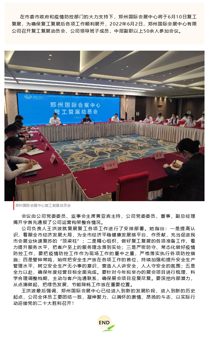 首頁(yè)新聞中心展會(huì)新聞文章詳情 文章詳情 昂揚(yáng)斗志、多措并舉,積極做好會(huì)展中心復(fù)工復(fù)展工作 在市委市政府和疫情防控部門的大力支持下,鄭州國(guó)際會(huì)展中心將于6月10日復(fù)工復(fù)展,為確保復(fù)工復(fù)展后各項(xiàng)工作順利展開(kāi),2022年6月2日,鄭州國(guó)際會(huì)展中心有限公司召開(kāi)復(fù)工復(fù)展動(dòng)員會(huì),公司領(lǐng)導(dǎo)班子成員,中層副職以上50余人參加會(huì)議。