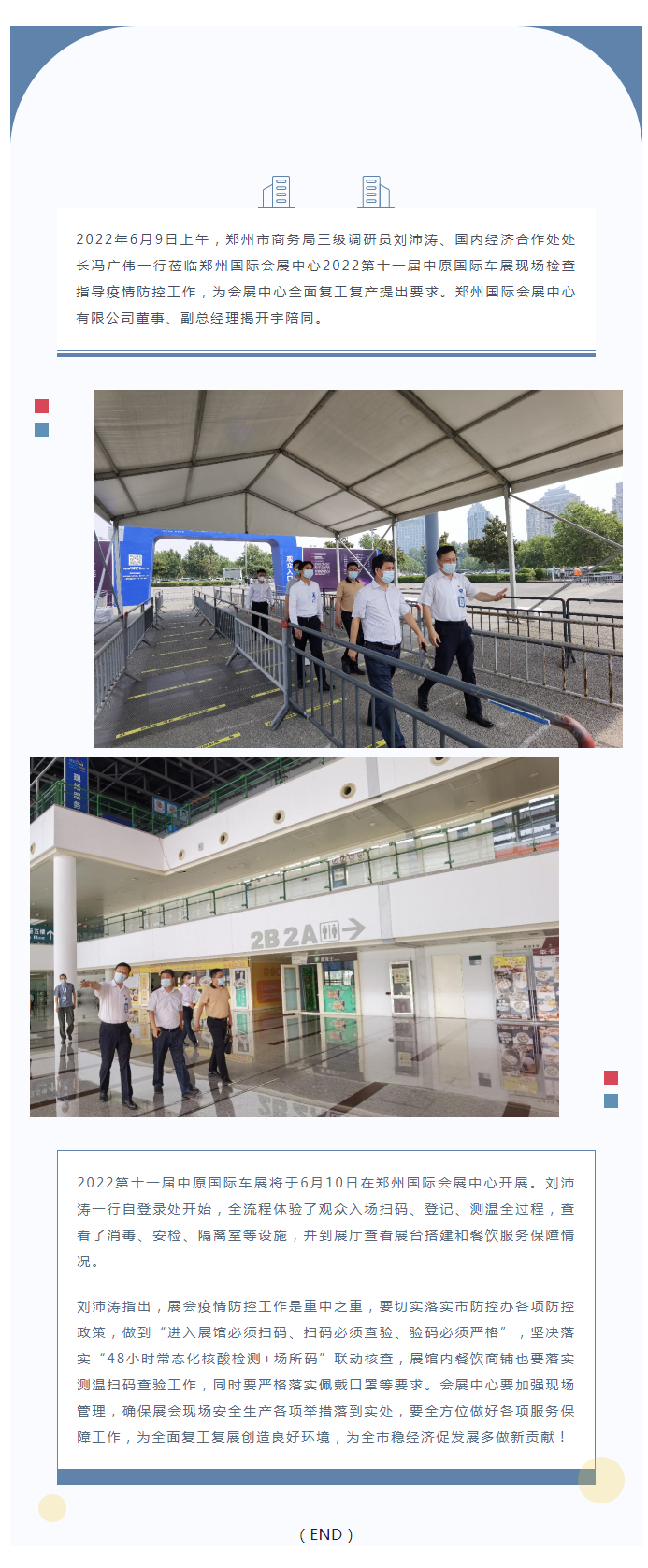 首頁新聞中心展會新聞文章詳情 文章詳情 鄭州市商務(wù)局三級調(diào)研員劉沛濤一行 蒞臨鄭州國際會展中心檢查指導(dǎo)復(fù)工復(fù)展和疫情防控工作 2022年6月9日上午,鄭州市商務(wù)局三級調(diào)研員劉沛濤、國內(nèi)經(jīng)濟合作處處長馮廣偉一行蒞臨鄭州國際會展中心2022第十一屆中原國際車展現(xiàn)場檢查指導(dǎo)疫情防控工作,為會展中心全面復(fù)工復(fù)產(chǎn)提出要求。鄭州國際會展中心有限公司董事、副總經(jīng)理揭開宇陪同。