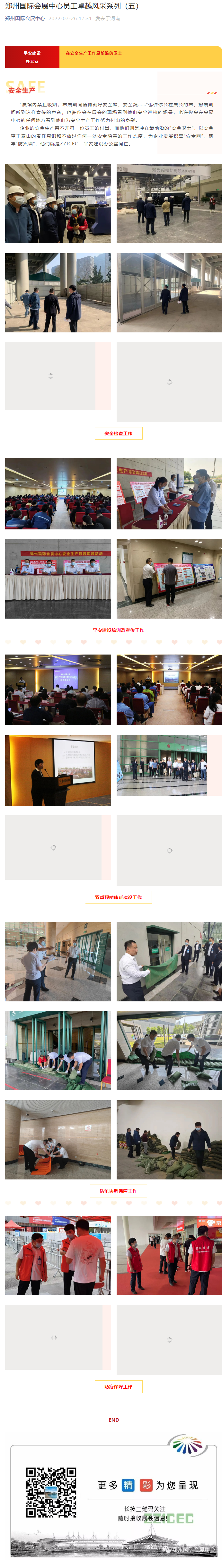 首頁(yè)新聞中心展會(huì)新聞文章詳情 文章詳情 鄭州國(guó)際會(huì)展中心員工卓越風(fēng)采系列(五) 企業(yè)的安全生產(chǎn)離不開每一位員工的付出,而他們則是沖在最前沿的“安全衛(wèi)士”,以安全重于泰山的責(zé)任意識(shí)和不放過任何一處安全隱患的工作態(tài)度,為企業(yè)發(fā)展織密“安全網(wǎng)”、筑牢“防火墻”,他們就是ZZICEC—平安建設(shè)辦公室同仁。