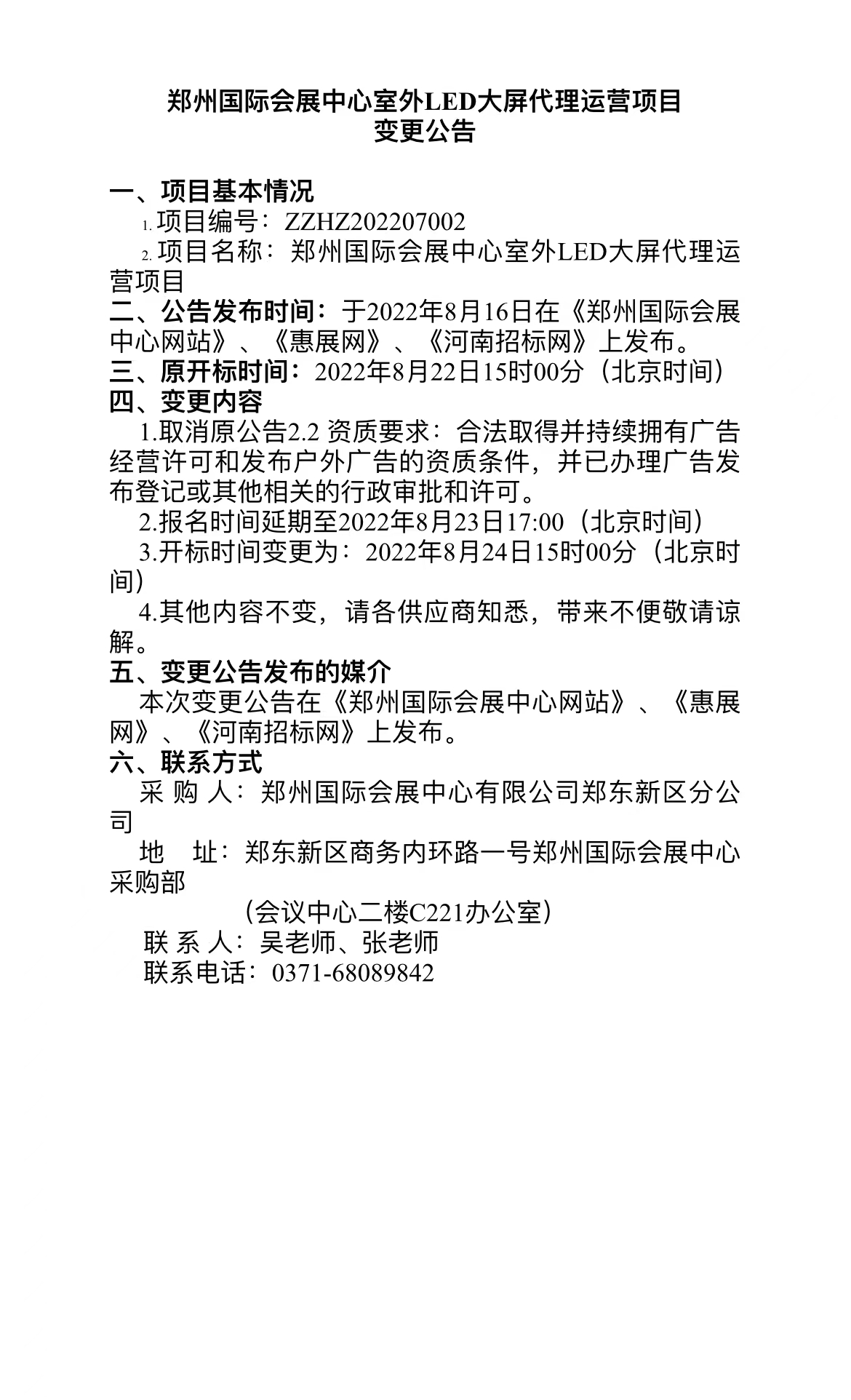 鄭州國際會展中心室外LED大屏代理運營項目 變更公告