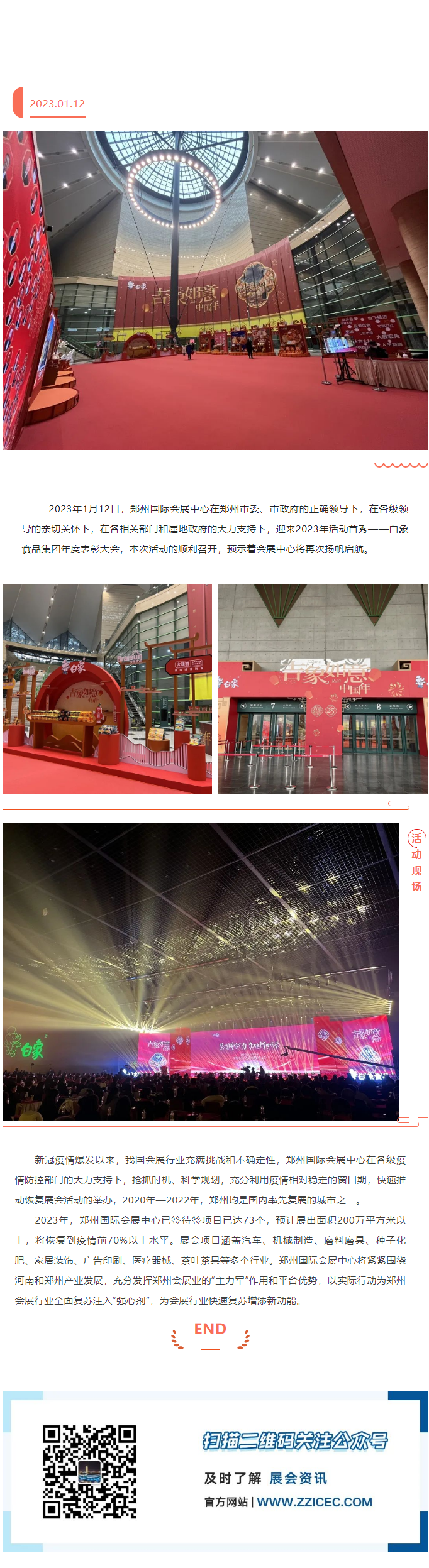 首頁(yè)新聞中心展會(huì)新聞文章詳情 文章詳情 新年迎首秀、揚(yáng)帆再啟航 2023年1月12日,鄭州國(guó)際會(huì)展中心在鄭州市委、市政府的正確領(lǐng)導(dǎo)下,在各級(jí)領(lǐng)導(dǎo)的親切關(guān)懷下,在各相關(guān)部門和屬地政府的大力支持下,迎來2023年活動(dòng)首秀——白象食品集團(tuán)年度表彰大會(huì),本次活動(dòng)的順利召開,預(yù)示著會(huì)展中心將再次揚(yáng)帆啟航。