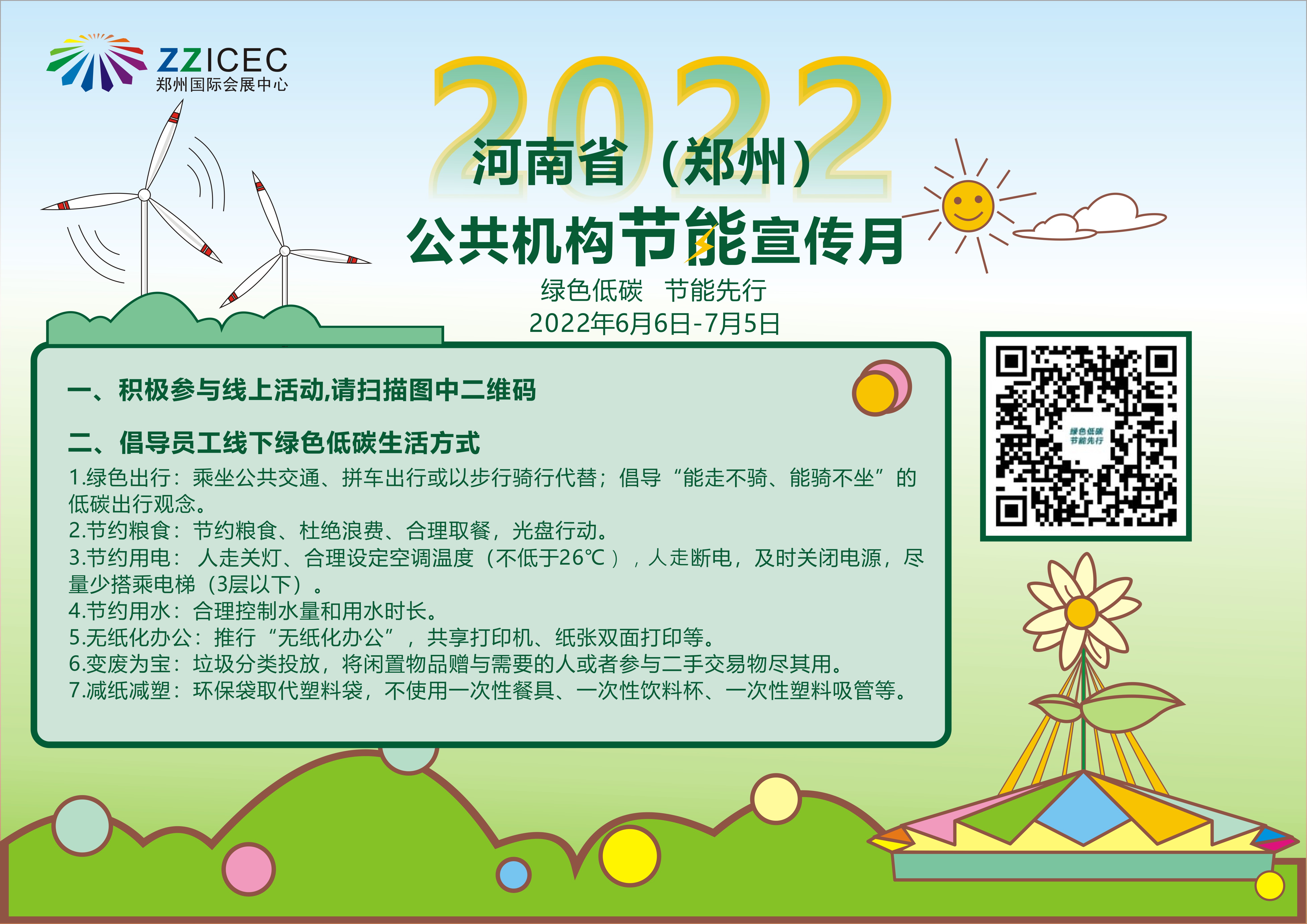 6月15日為全國低碳日,主題為“綠色低碳,節(jié)能先行”的河南省公共機(jī)構(gòu)節(jié)能宣傳月活動(dòng),于6月6日正式啟動(dòng),將持續(xù)至7月5日。為響應(yīng)宣傳月號召,活動(dòng)期間,鄭州國際會(huì)展中心積極傳播節(jié)能降碳和綠色發(fā)展理念,提高能源資源利用效率,綜合運(yùn)用公眾平臺線和線下宣傳手段,號召員工積極參加節(jié)能宣傳月線上活動(dòng),倡導(dǎo)員工簡約適度,綠色低碳生活方式和辦公理念,反對食品浪費(fèi)等內(nèi)容,營造綠色發(fā)展、崇尚節(jié)約的氛圍,人人爭當(dāng)綠色低碳、節(jié)能先行的宣傳者、行動(dòng)者、引領(lǐng)者。